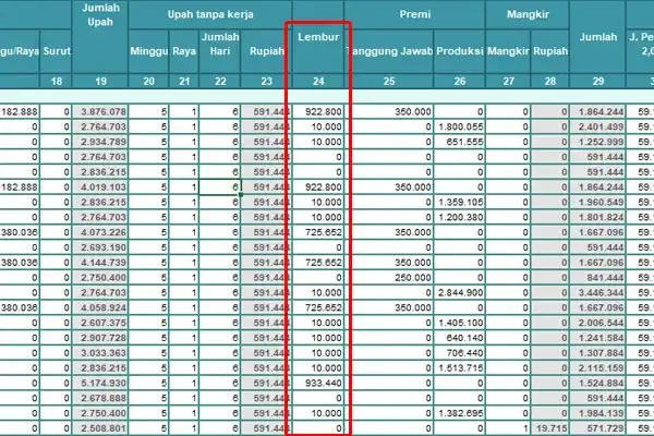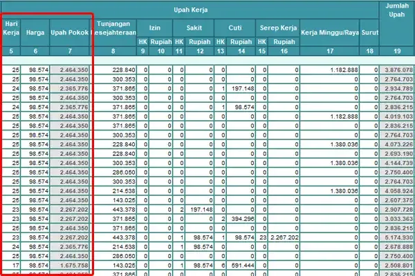 Sebagai contoh pada bulan Januari ada 5 hari minggu dan 1 libur nasional (Tahun baru), maka setiap karyawan akan mendapatkan 6 HK dikali upah pokok harian sesuai dengan jabatan/golongan karyawan tersebut.
